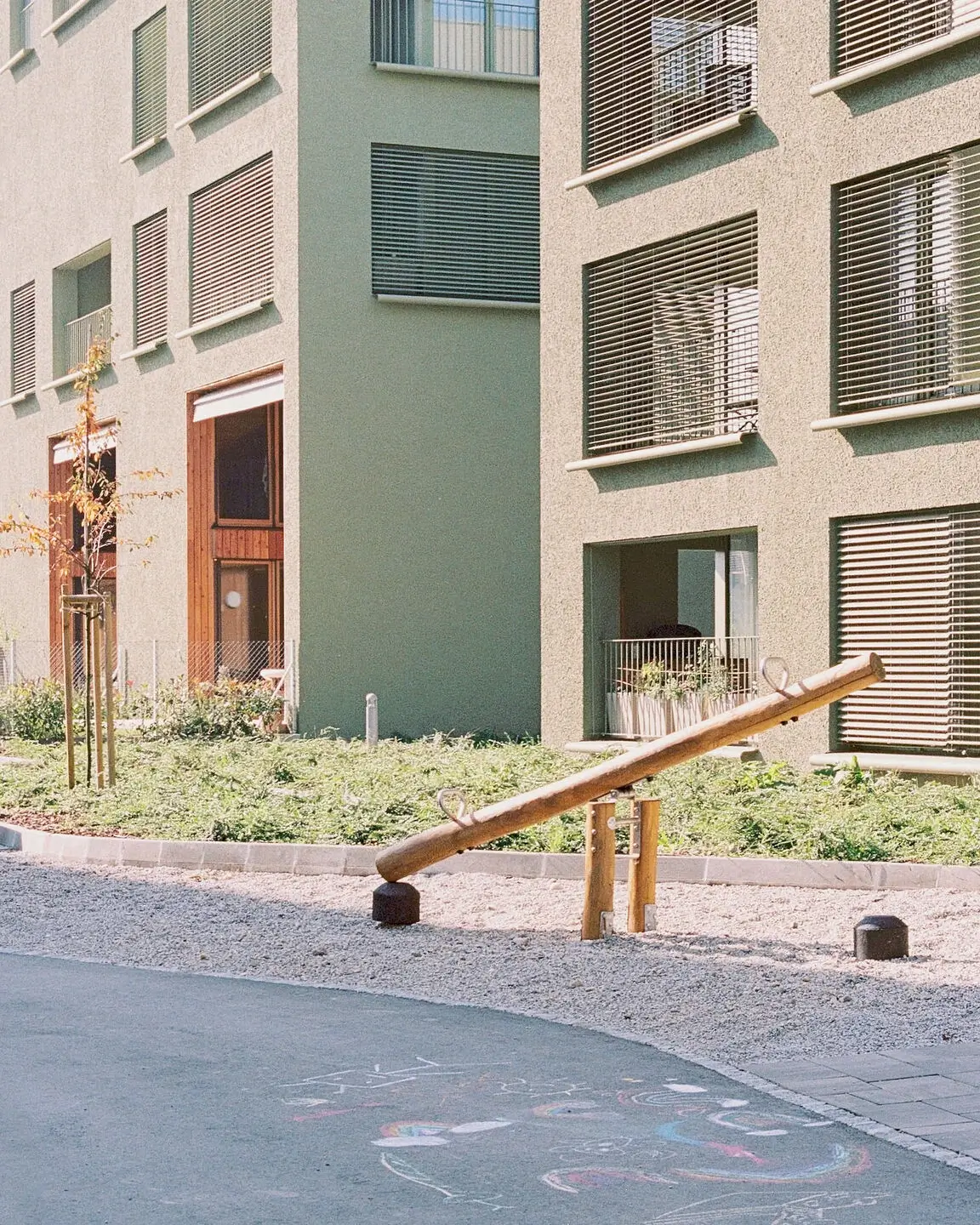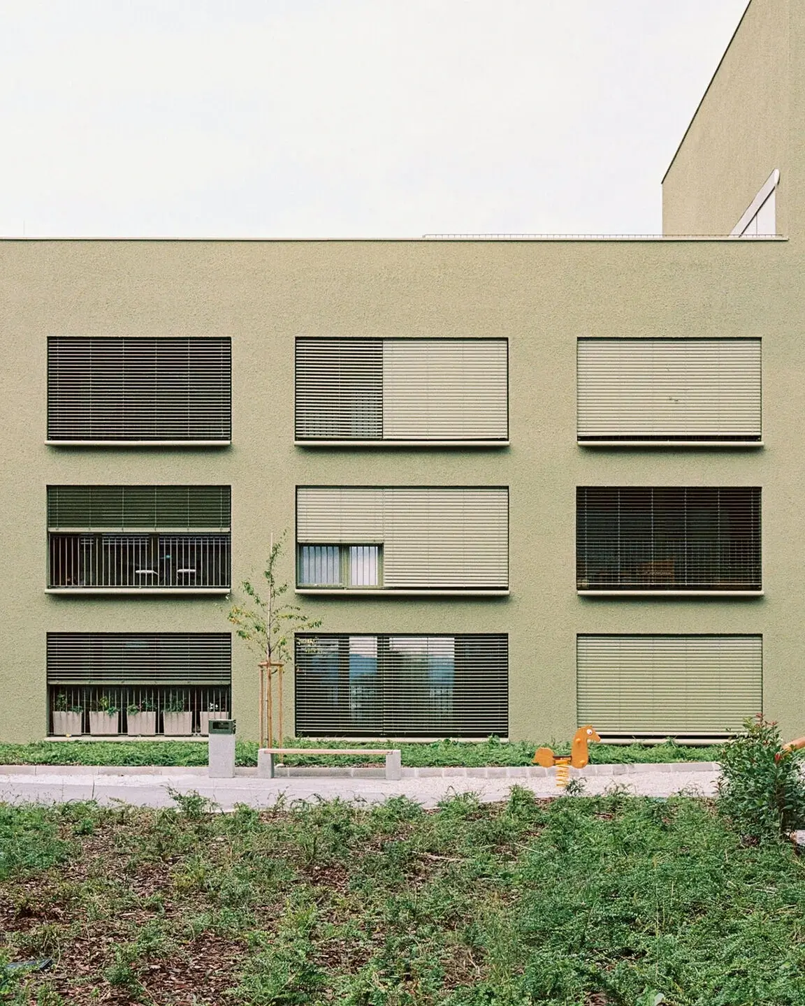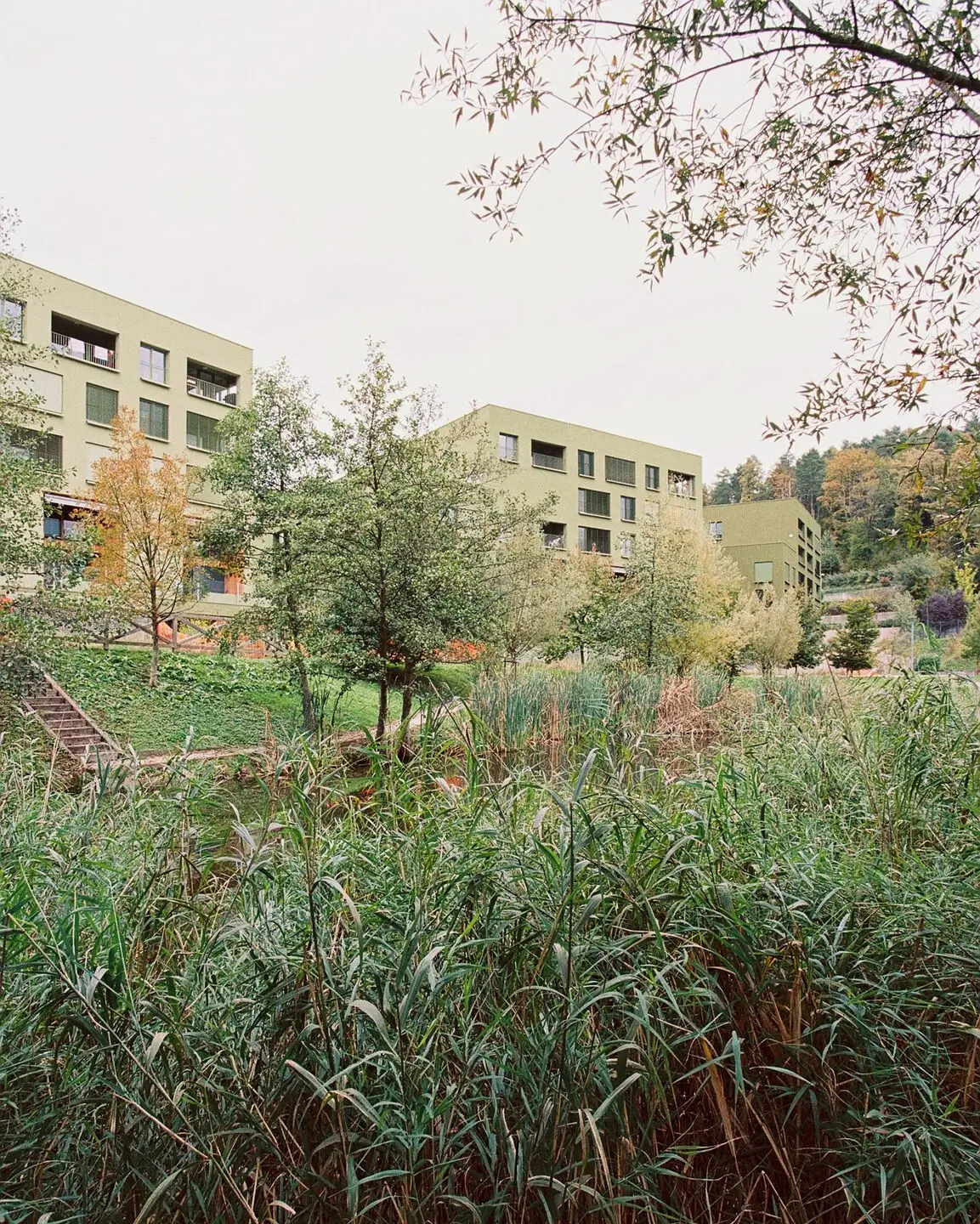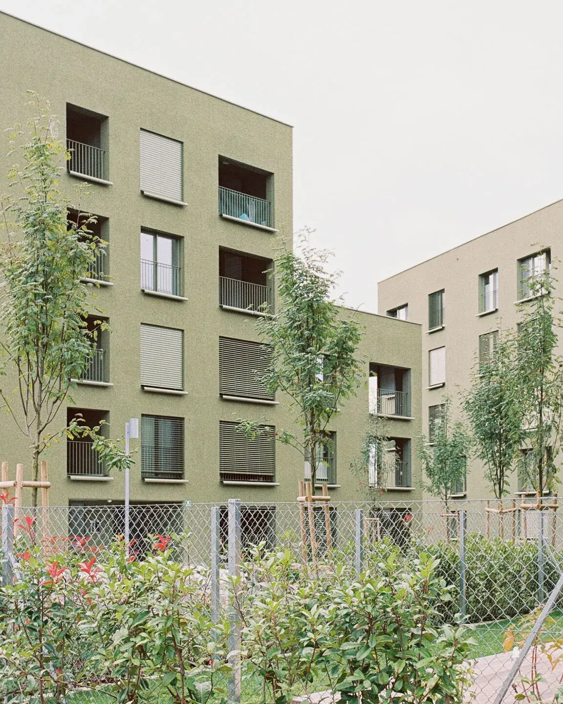 The Nordlick Apartments occupy a former industrial site on the outskirts of Munich, where an old brickworks once stood beside a quiet lake. The development transforms the disused area into a contemporary residential quarter made up of six linear buildings — arranged in two rows of three, following a southwest to northeast orientation, with each block slightly offset to soften the composition. The architectural concept focuses on blending built form with landscape. Each façade is finished in a gradient of green tones that deepen towards the trees, allowing the buildings to visually dissolve into their surroundings.