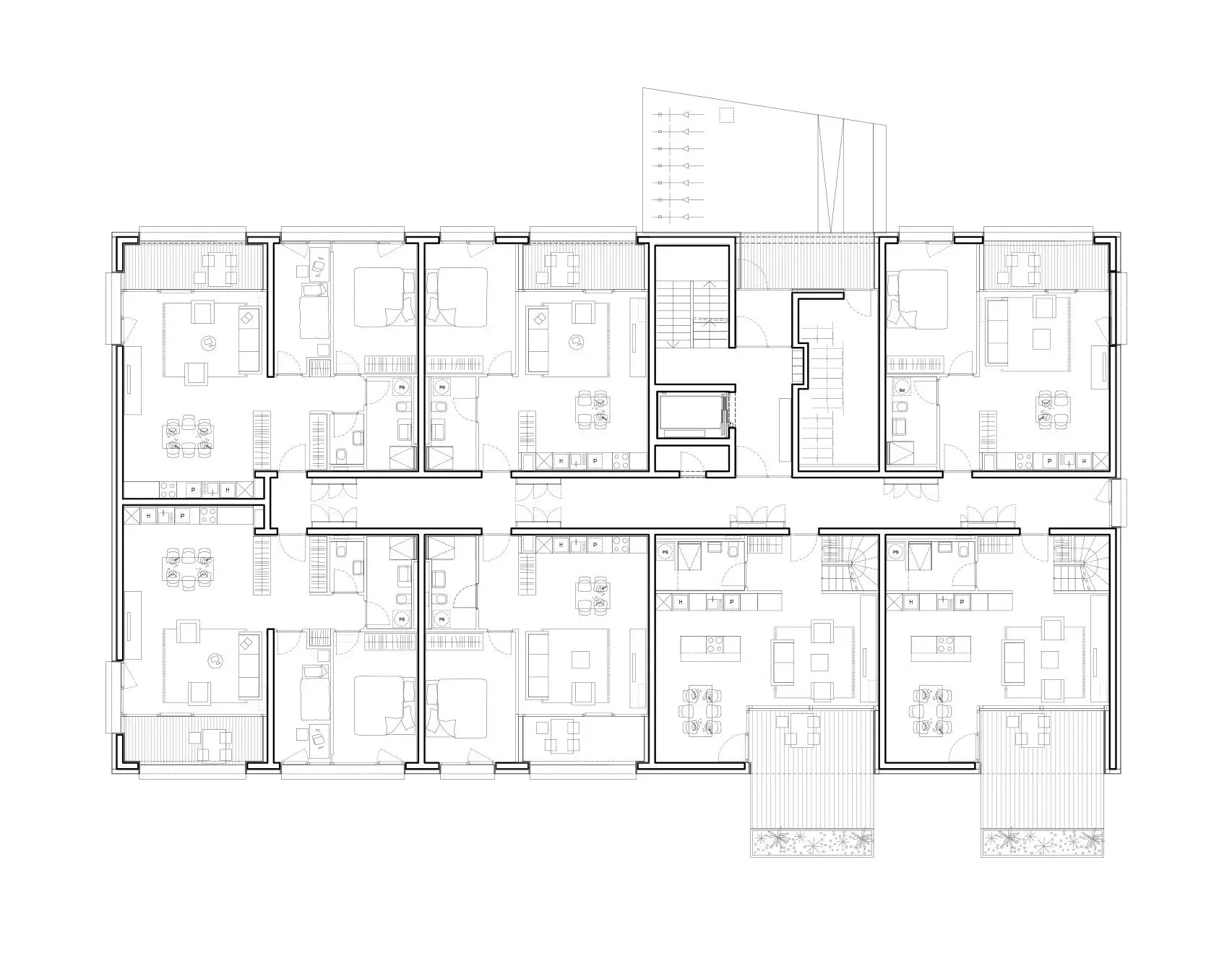 Inside, every block follows a clear and functional layout: apartments line both façades, connected by a central corridor. Variations within this structure introduce unique living experiences — duplex homes with private gardens at ground level, terrace apartments with large outdoor areas above, and senior-friendly units positioned at the lower levels facing the water. The external character is minimalist yet tactile, defined by rough-textured cladding, deep horizontal eaves, and generous corner windows that open the interiors to light and views. Timber detailing and extensive glazing mark out the duplex and terrace units, giving the overall composition warmth and variation.