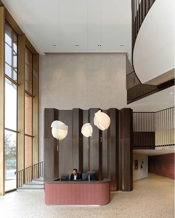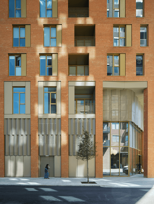 The scheme houses 183 residential units, above three levels of retail and incubator office spaces, as well as roof gardens and a new public realm. Its animated silhouette and colonnaded base, situated opposite the Tottenham Hale transport hub, create a memorable new identity rooted in place. It references the area’s industrial heritage, particularly the adjacent Berol House which was once part of the Eagle Pencil Company Factory, with a ‘carved’ and animated perimeter block. This is expressed through a distinctive, faceted form and a more pronounced verticality. With a rich orange brick outer skin and a shimmering metal inner skin, the design is inspired by the graphic colors and hexagonal forms of the iconic Berol Eagle Pencil. These have been translated formally as abstract surface patterns within the building.